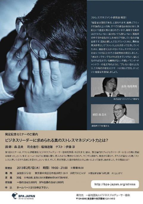 + ストレスマネジメント研究会発足! ストレスマネジメント研究会, 12月 15, 20122月 27, 2024, 研究会開催案内, 0 会長:稲畑達雄 株式会社ベストメディア取締役 顧問:森昌夫 康復医学学会理事長 「経営者は孤独である」と言われます。 組